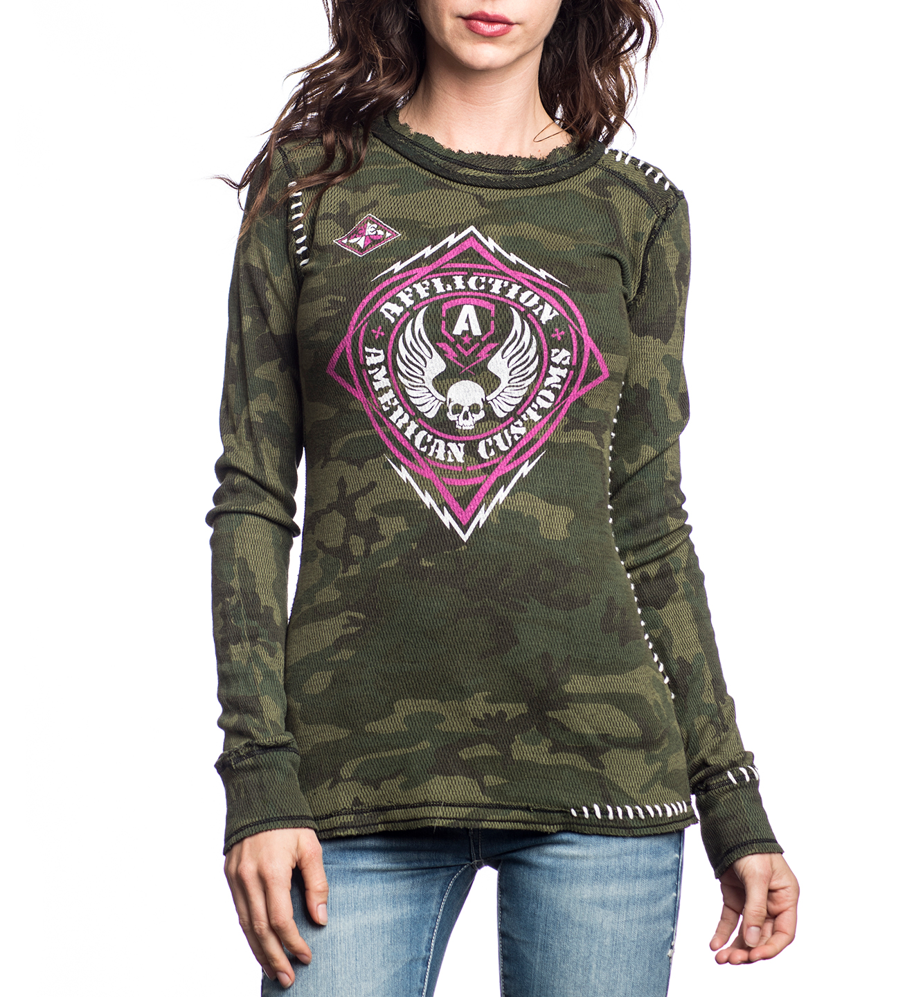 Slim fit women’s thermal, crew neck collar, long sleeves with cuff detail, reversible feature, 100% cotton, machine wash cold.